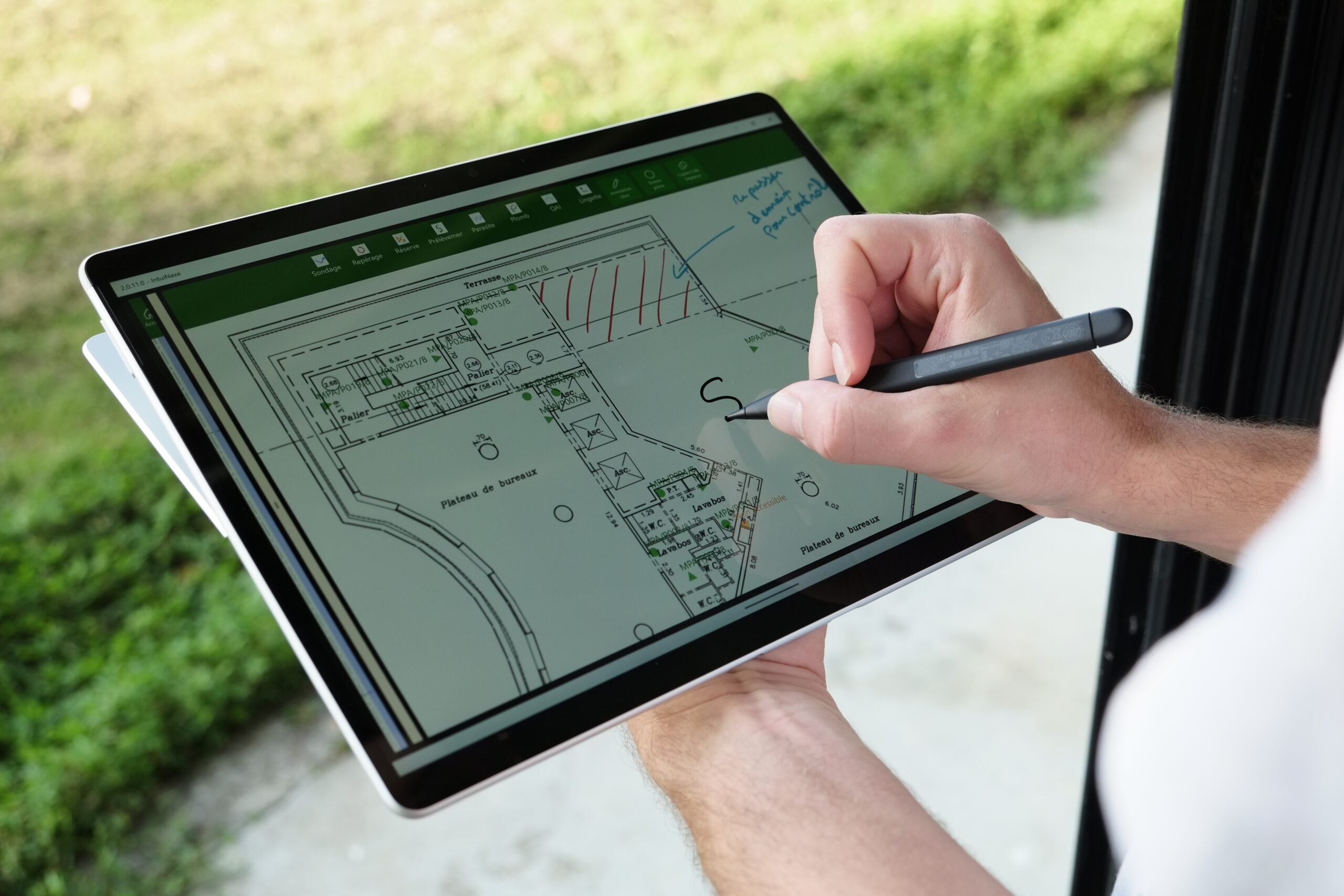 The IntuiNaxe application allows technicians to accurately record all sampling‑related information directly onto building plans. The application relies on several AI‑based approaches combined with a modelling system based on two‑dimensional grammars—a language that describes the structural constraints of a drawing; for example, a door must necessarily be framed by two walls.